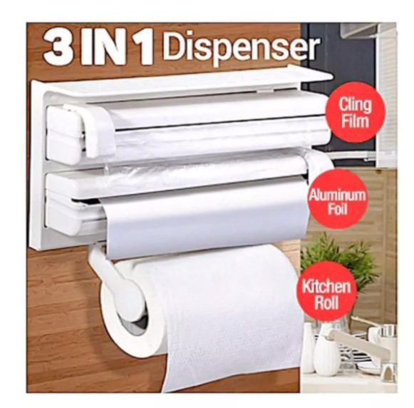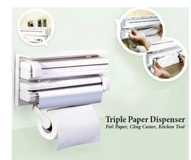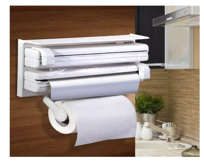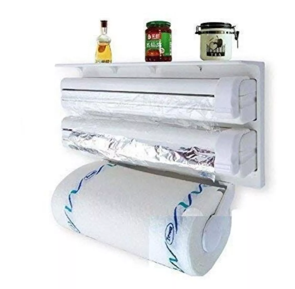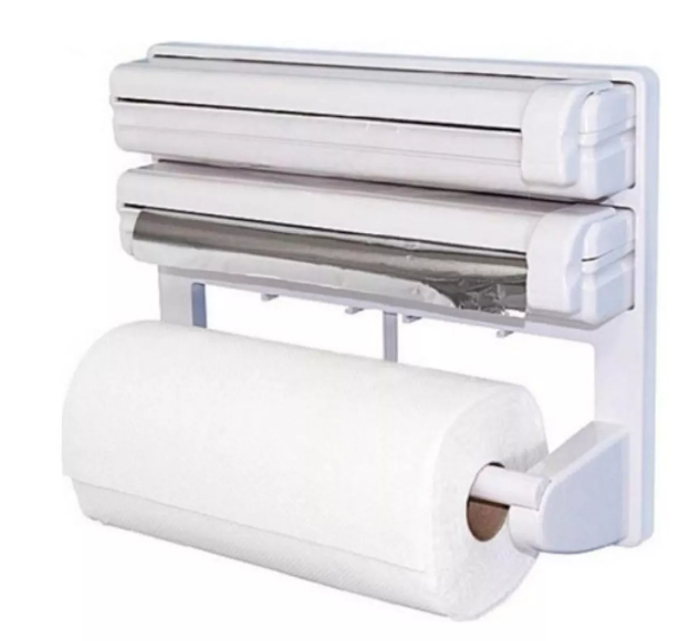 Dispensador De Papel De Cocina 3 En 1 Aluminio Plástico @@-Porta rollos triple para rollo de plástico, de aluminio y papel. @-El colgador de cocina triple de es adaptable a todos los rollos de cocina estándar del mercado @-El colgador de cocina triple permite mantener tu cocina siempre ordenada